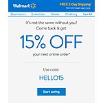 Received an email from Walmart. Take 15% off on your next walmart.com order with promo code: