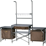 Take camp cuisine to a whole new level of convenience when you set up our Deluxe Camper's Kitchen. Powder-coated steel frame and heavy-duty 600-denier polyester compartments set up quick and easy so you're ready to start cooking immediately. Two hanging pantries keep spices and cooking utensils handy. Pantries include five total shelves that are customizable. Ultradurable melamine table top simplifies food prep. Sturdy steel storage rack below main table holds heavier pots and pans. Pliable PVC sink handles everything from cleaning fish to doing dishes. Spice rack has seven clips below for hanging utensils. When the sun is setting, two 80" lantern hooks keep your camp kitchen illuminated. Includes nylon storage bag.