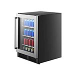 Hisense 140-can beverage cooler has a sleek and modern design with stainless steel door frame and handle. Its low-E glass door stores your favorite beer, soft drinks and wine at the perfect temperature. Digital controls and three glass shelves provide a premium look while offering superb functionality. This beverage cooler is a front-venting unit and can be installed for built-in applications or as a freestanding model.Ă‚ The reversible door design also allows for flexible installation and placement.