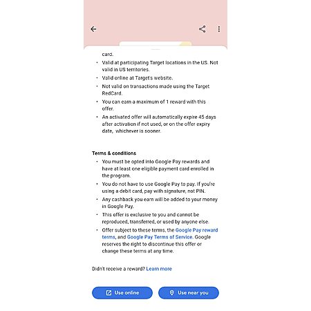 • You do not need to pay with Google Pay to redeem offer, but you must use the enrolled card on Google Pay for the purchase (not valid on transactions using the Target RedCard).