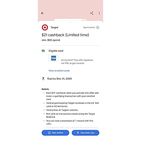 Google Pay via Google Pay App (Android or iOS) offers $21 Cashback when you Spend $50+ at Target (online or in-store) using your Enrolled Card for the purchase (see the instructions below).