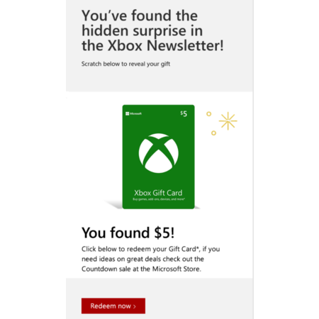 "Gifts for Gamers Made Easy". Scroll down the email towards the bottom and look for a graphic of green trophy with the Xbox emblem. To the right of the trophy is a small wrapped gift box that should be jiggling. Click on the gift box to You've Found the Hidden Surprise in the Xbox Newsletter!