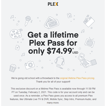 Just received an offer to purchase a lifetime Plex Pass for $74.99 via email. The email contained a one-time use, unique coupon code to apply at checkout. Subject of the email was "Pay $74.99 USD today, get Plex Pass for life.", from the following email address: [email protected]