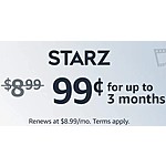 Amazon.com offers Prime Members: Starz Streaming Service Subscription on sale for $0.99/Month for 1st 3-Months.