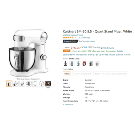Cuisinart SM-50 5.5 - Quart Stand Mixer, White $179.99 w/ Coupon