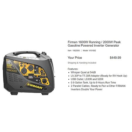Enjoy the great outdoors in comfort. The W01682 inverter portable generator is the Campers must have. Best used for camping, tailgating and recreational use power supply. This portable unit is light weight and easy to use but powerful enough to handle your power needs. In addition, the Parallel Cables that are included enable you to connect this unit to another FIRMAN Inverter to double your power. Power Up, Be Safe!