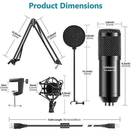 • Microphone-core: Dia.16mm Condenser; USB Cable Length: 78.7 inches/200 centimeters