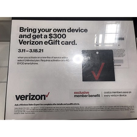 Costco Verizon BYOD and activate a new line to get $300 Verizon eGift Card - In store only