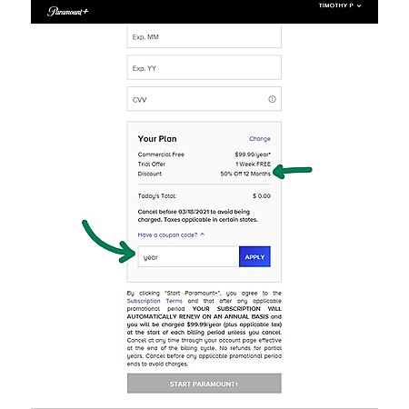Fine print on offers tab "Paramount+ account activation not valid during discount promotional periods."