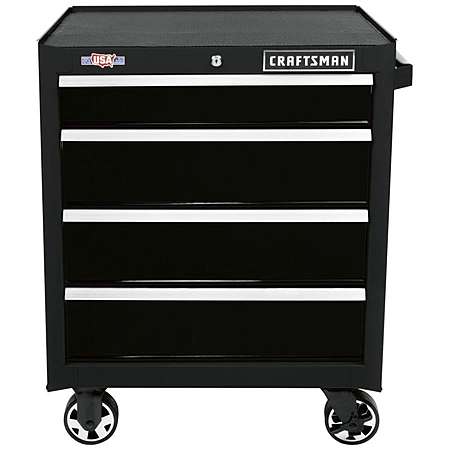 Proudly Made in the USA with Global Materials in Sedalia, Missouri. The 2000 Series CRAFTSMAN® 26-in Wide 4 Drawer Rolling Tool Cabinet utilizes an all steel I-Frame® Double Wall Construction. Each drawer can support 75-lbs and features heavy-duty soft close drawer slides that gently pull themselves shut without slamming. This helps keep your tools in place and ensures your drawers stay closed. The 4-1/2-in x 1-1/2-in casters with 2 that lock and 2 that swivel support up to 650-lbs!