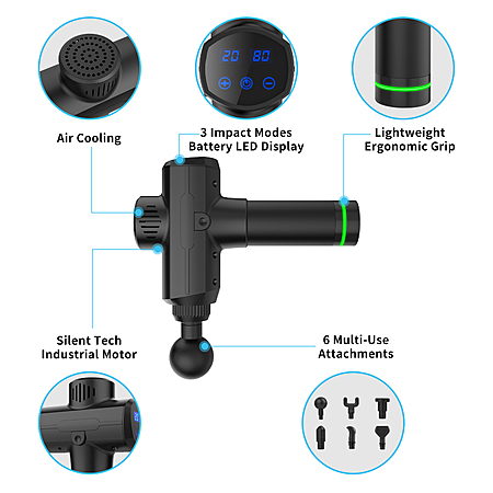 Accurate perceive massage, 10 minute automatically off function. 6 customized massage heads, 5 adjustable percussive speeds to meet your various muscle relaxation needs.
