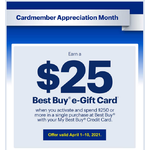 Obviously, you need to be a Best Buy Credit Card holder for this deal. Got this in my e-mail yesterday. Offer needs to be activated on the card. Spend $250 in a single transaction between April 1 and April 10 online or in-store and receive a $25 e-Gift card, which will be sent 5-6 weeks after the end of the promotion.