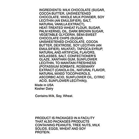 - Milk Chocolate (Sugar, Cocoa Butter, Unsweetened Chocolate, Whole Milk Powder, Soy Lecithin (An Emulsifier), Salt, Natural Vanilla Extract), Heat-treated Wheat Flour, Sugar, Palm Kernel Oil, Dark Brown Sugar, Vegetable Glycerin, Semi-sweet Chocolate Chips (Sugar, Unsweetened Chocolate, Cocoa Butter, Dextrose, Soy Lecithin (An Emulsifier), Milkfat), Tapioca Syrup, Natural And Artificial Flavors, Molasses, Salt, Confectioner's Glaze, Xanthan Gum, Sunflower Lecithin, To Maintain Freshness (Potassium Sorbate, Rosemary Extract (Canola Oil, Natural Flavor, Natural Mixed Tocopherols, Ascorbic Acid, Sunflower Oil, Citric Acid, Sunflower Lecithin)).