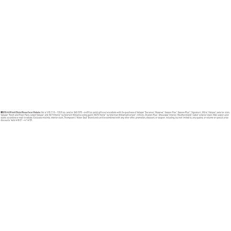 Valid on select items of 1 gallon can (110-128 fl oz) or 5 gallon pail (570-640 oz). Rebate varies based on size of can/pail purchased. Actual fluid ounces in cans/pails vary based on choice of product and color. Cannot be combined with any other offer, promotion, discount or coupon, including but not limited to any quotes. Product selection may vary. Offer excludes mistints and all clearance prices products. See store associate for details
