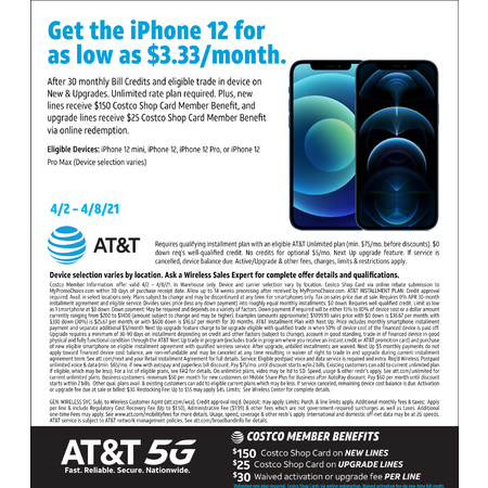iPhone 12 starting at 3.33/month for ATT via eligible trade in + Costco giftcard based on New / Upgrade $100