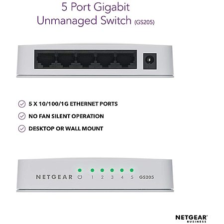 Model: NETGEAR 5-Port Gigabit Ethernet Unmanaged Switch (GS205) - Desktop, Ethernet Splitter, Plug-and-Play, Silent Operation