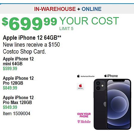 iphone 12 pro 128G $850, Tmobile new line receive $150 costco shop card.