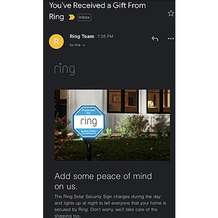 ***** For targeted audience Ring sending an email with promo code for Free Ring Solar sign with free shipping.