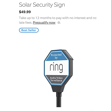 Warn crooks that your home is off-limits and stop crime before it happens with the Solar Security Sign. Just a few hours of sunlight everyday will keep your Sign charged all night, so your neighborhood will know that your home is protected by Ring.