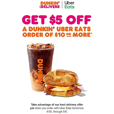 Dunkin' Donuts | Uber Eats: $5 Off $10+ Purchases w/ Uber Eats Delivery *Starts 4/30*