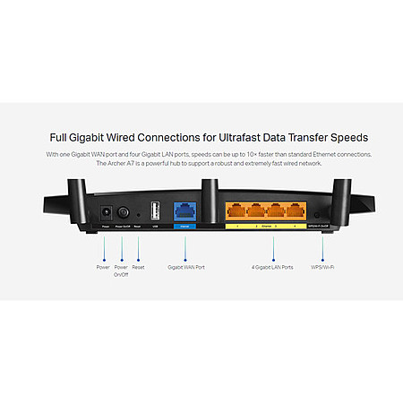 • P-Link Archer C7 router works with 2.4GHz and 5GHz bands simultaneously to satisfy your bandwidth requirements, and three high-quality external antennas increase the signal distance without sacrificing speed. This TP-Link Archer C7 router has one WAN port and four LAN ports for wired connections.