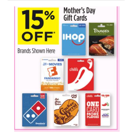 Dollar General in store, 15% off select gift cards, IHOP, Panera Bread, Fandango, Chili's, Domino's, Cracker Barrel, Chili's/Maggiano's/On the Border (YMMV, regional?)
