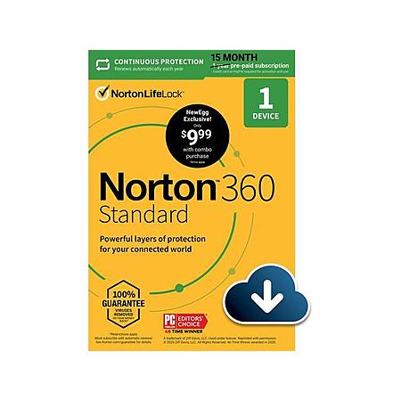 - 15-Month Norton 360 Antivirus Software (1 Device) + 3-Month Free VPN/Cloud Backup/Dark Web Monitoring w/ Auto Renewal