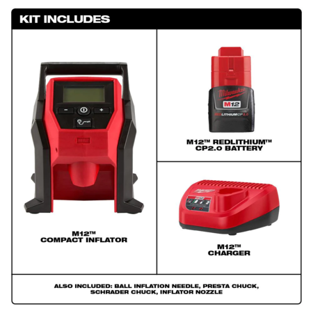 Milwaukee M12 12-Volt Lithium-Ion Cordless Compact Inflator with 2.0 Ah Battery and Charger- Large easy to read back-lit LCD