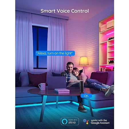 • Hands-Free Voice Control: Free your hands up with convenient voice assistant, compatible with Amazon Alexa and Google Assistant, easily turn on/off the strip lights, set colors, adjust brightness, set up music mode, and scene modes by voice control.
