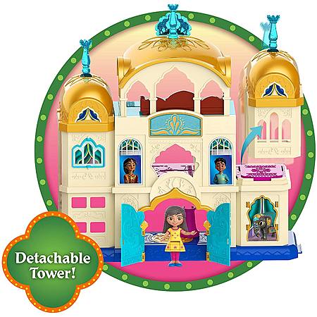 • 16 Pieces: Palace with removable tower, one articulated Mira figure, one articulated Priya figure, Mikku figure, Chikku figure, table, two stools, sewing table, tiara, sitar, stairs, zip line rope with hook, detective notebook, and magnifying glass