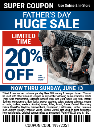 Limit 1 coupon per customer per day. Save 20% on any 1 item purchased. *Cannot be used with other discount, coupon or any of the following items or brands: Inside Track Club membership, Extended Service Plan, Gift Card, Open Box Item, Instant Savings, compressors, floor jacks, power stations, safes, storage cabinets, chests or carts, trailers, welders, Admiral, Ames, Atlas, Avanti, Bauer, Central Machinery, Cobra, CoverPro, Daytona, Diamondback, Drummond, Earthquake, Fischer, Hercules, Icon, Jupiter, Poulan, Predator, Viking, Vulcan, Zurich. Not valid on prior purchases. Non-transferable. Original coupon must be presented. Valid through 6/13/2021.