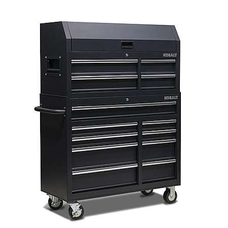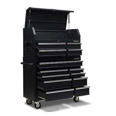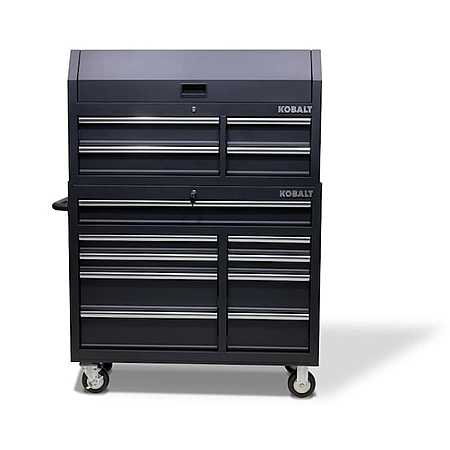 The Kobalt 42 in. 13 drawer tool chest and cabinet set is great for storing and organizing all your tools and hardware. The unit is made from high grade all welded steel construction with a tough, rust-resistant powder coat finish. 13 Drawers are all soft-close full-extension and glide effortlessly on ball-bearing slides that can support up to 100 lbs. you can charge your electronics and power tools even when the chest is locked via the integrated power strip with 4-outlets and 2-USB ports. An ergonomic handle and 5 in. x 2 in. casters allow you to easily move your cabinet around your workspace. Total weight capacity of the unit is 1,200lbs. both the till and chest have lock system for added security.
