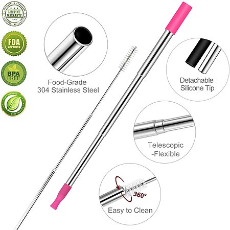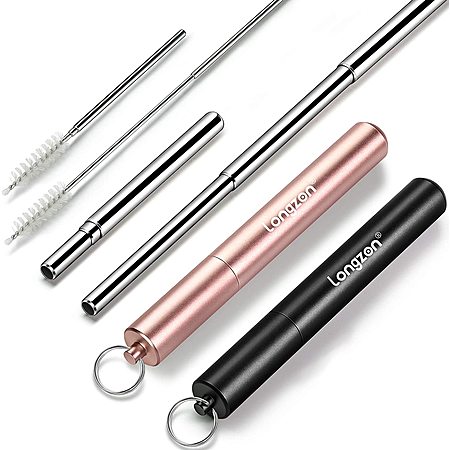 Longzon Set of Two Telescopic Metal Straws – Reusable, Portable, Collapsible Stainless Steel Drinking Straws with 2 Aluminum Key-chain Case for Travel.