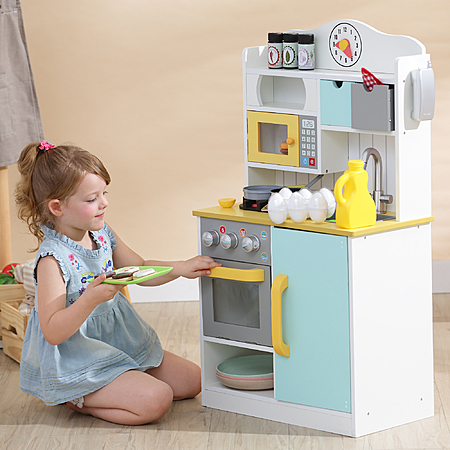 • The kitchen features a stylish and versatile design that complements a wide range of decors. It has many fun functions for endless hours of exciting play, including openable oven door, openable microwave door, two oven hobs, toy clock, one removable sink, 3 knobs which turn and click for lifelike noises.