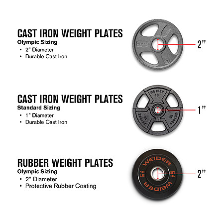 Model: Weider 210 lb. Cast Iron Olympic Hammertone Weight Set