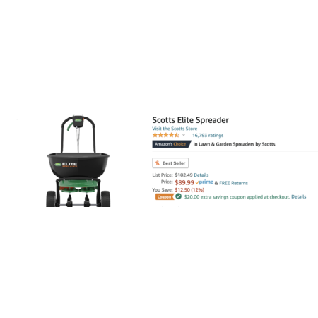 Scotts Elite spreader is on amazon for $10 and an extra 20 off with clickable coupon on site.