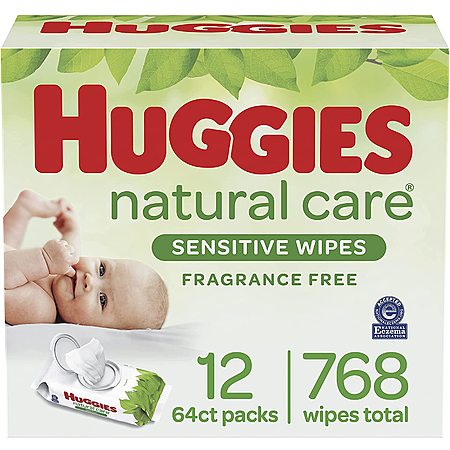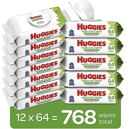 12 flip-top packs of 64 Huggies Natural Care Sensitive Baby Wipes, Unscented (768 wipes total); National Eczema Association Seal of Approval