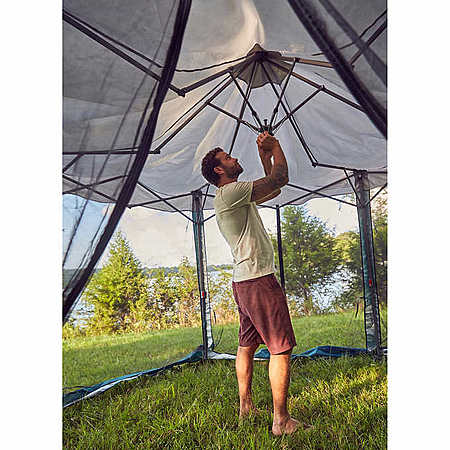 I have had both this tent (which is a licensed design made by several manufacturers) and the screen house mentioned in the comments. This tent is intended to be an instant pop up tent and is fast to set up. That being said, the other one is pretty quick and easy too, just not as fast. The instant tent is much more sturdy, but has less airflow as more of the roof is covered...good for rain, bad for airflow. Due to the slanted nature of the other tents walls and smaller roof in the comments, there is a lot of airflow. The listed tent doesn't have any flaps or extra material at the bottom to create a better seal/barrier for bug entry. It just depends on what your use case is. The listed tent is a durable, fast setup tent with plenty of space. The tent in the Comments has much better airflow but is more flimsy, takes a minute or two longer to setup, and is smaller/has less rain coverage.