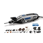 Includes: 407 EZ drum mandrel, 408-1/2 in. 60-Grit sanding (3-pieces), 432 1/2 in. 120-Grit sanding (4-pieces), 445 1/2 in. 240-Grit sanding (3-pieces), EZ402 EZ lock mandrel, EZ411 EZ lock sanding disc - coarse (3-pieces), EZ412 EZ lock sanding disc - medium (3-pieces), EZ413 EZ lock sanding disc - fine (3-pieces), ez456 metal 1-1/2 in. Cut-Off Wheel (3-pieces), 107 1/8 in. engraving HS cutter, 191 1/8 in. high speed cutter, 561 spiral bit, 8193 5/8 in. aluminum oxide, 84922 3/16 in. silicon carbide, 932 3/8 in. aluminum oxide, 401 screw mandrel, 403 brush wheel, 414 felt polishing wheel (2-pieces), 421 polishing compound, 429 felt polishing wheel (2-pieces), 428 carbon brush wheel, 150 1/8 in. drill bit, 403 bristle brush, pivot light, shield, sanding / grinding guide, garden tool sharpener and cutting guide