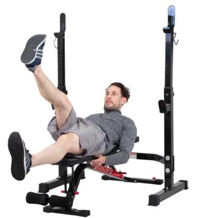- Two-piece Set designed for versatility (includes 1 Olympic Weight Bench, and, 1 Squat Rack). Independent 2-way Adjustable Bench with high-density padding: 7-position settings for Back-pad Cushion, and, 2-position settings for Seat Cushion Stand-alone Squat Rack features Double-deck Safety? with 2 sets of integrated catches (Upper set: for standing/upright positions; Lower set: for flat, incline, decline positions)