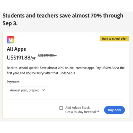 Adobe Creative Cloud (all apps, students and teachers) $191.88 at Adobe