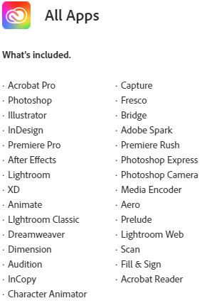 I mean you get a vast wealth of advanced software- Acrobat Pro, Photoshop, Lightroom, After Effects, Premiere, Illustrator, and on and on, not to mention Adobe font library.