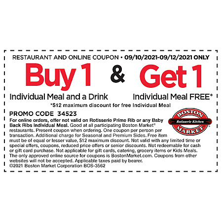 Boston Market [store locator] offers Buy 1 Individual Meal & Drink, Get a 2nd Individual Meal for Free using promo code 34523 for online orders or in-store when you print or present this coupon on your mobile device at participating locations.