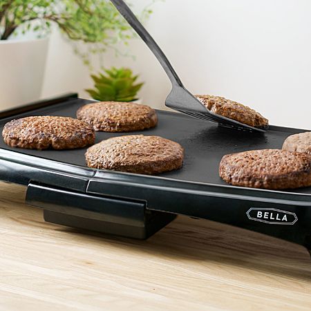 Model: BELLA Electric Griddle with Crumb Tray - Smokeless Indoor Grill, Nonstick Surface, Adjustable Temperature Control Dial & Cool-touch Handles, 10" x 16", Black