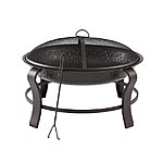 - Round outdoor fire pit set with mesh screen, poker, wood grate, and cover