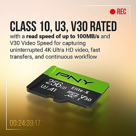 - Class 10, U3, V30 speed class performance with read speeds up to 100MB/s for fast and smooth burst mode HD Photography and 4K Ultra HD Videography