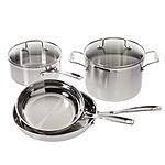 6-Piece Cookware Set Includes: 3 Qt. Sauce Pan w/Cover, 6 Qt. Stock Pot w/ Cover, 9" Skillet, 11" Skillet Professional Triple Ply Construction features a core of pure aluminum and a brushed stainless exterior