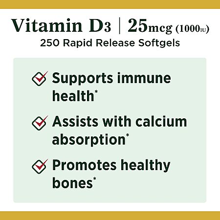 - In addition to immune support, getting a sufficient amount of Vitamin D is critical to building and maintaining strong bones in adults. It is essential for calcium absorption to help support healthy bones. Nature's Bounty Vitamin D3 Softgels supplement the Vitamin D your body needs for overall health