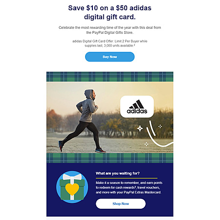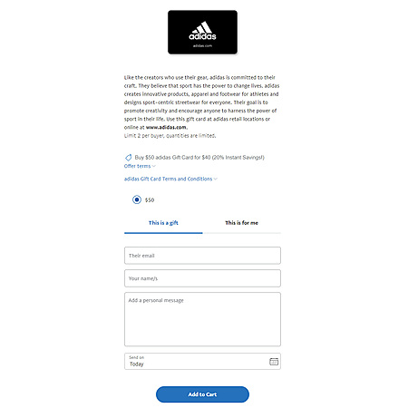adidas Gift Cards may be redeemed for merchandise on adidas.com and in adidas Sport Performance, adidas Originals, and adidas Outlet stores in the United States.