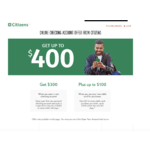 Eligibility: Customer must open their first new checking account via Citizens' online account opening system accessed by clicking on one of the links on this page. Customer should print this screen for their records. Customer will only be paid a one-time bonus for this program. One debit card bonus per checking account. Offers may be withdrawn without notice and cannot be combined with any other checking offer. Offer eligibility is determined at Citizens' sole discretion.